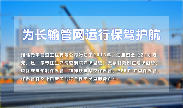 河北元豐管道工程有限公司始建于2013年,注冊資金2218萬元。是一家專注生產鋼套鋼蒸汽保溫管、聚氨酯預制直埋保溫管、噴涂纏繞預制保溫管、鍍鋅鐵皮架空保溫管、PERT-Ⅱ型保溫管、保溫管件及補口安裝的綜合性研發型服務企業。